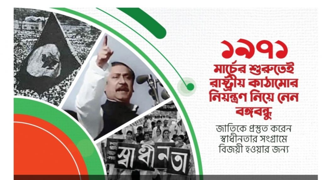 প্রথম সপ্তাহের মধ্যেই এই ভূখণ্ডের সরকারি-বেসরকারি প্রশাসনের একক নেতৃত্ব চলে আসে বঙ্গবন্ধুর হাতে। দ্বিতীয় সপ্তাহ শেষ হওয়ার আগেই পুরো দেশ চলতে শুরু করে বঙ্গবন্ধুর নির্দেশ মেনে। বাস্তব অর্থে, শুধু সামরিক ছাউনিগুলো ছাড়া আর কোথাও পাকিস্তানিদের নিয়ন্ত্রণ ছিল না। ভেঙে পড়ে পাকিস্তানের সরকার ব্যবস্থা। বঙ্গবন্ধুই তখন বাংলাদেশের অঘোষিত রাষ্ট্রপ্রধান এবং ধানমন্ডির ৩২ নম্বর বাড়ি পরিণত হয় ‘বিকল্প রাষ্ট্রপ্রধান’-এর সদর দফতরে। অবস্থা বেগতিক দেখে, পাকিস্তানি জান্তা ও রাজনীতিকরা ঢাকায় এসে বঙ্গবন্ধুকে আলোচনার আহ্বান জানান। রাজনৈতিক কারণে বঙ্গবন্ধু তাদের সঙ্গে বৈঠকে বসেন, কিন্তু দেশজুড়ে অসহযোগ আন্দোলনের কার্যক্রমও গতিশীল রাখেন। পাকিস্তানিদের ষড়যন্ত্রে পা না দিয়ে, সর্বোচ্চ নেতা হিসেবে গণতান্ত্রিক প্রক্রিয়ায় ধাপে ধাপে নির্দেশনা দিতে থাকেন বঙ্গবন্ধু। সেসসব নির্দেশ মেনে স্বাধীনতা যুদ্ধের জন্য প্রস্তুত হতে থাকে মুক্তির স্বপ্নে মগ্ন সাত কোটি জনতা। অবশেষে ২৫ মার্চ কালরাতে হানাদার বাহিনী ঘুমন্ত বাঙালির ওপর আক্রমণ চালালে, বঙ্গবন্ধু আনুষ্ঠানিকভাবে স্বাধীনতা ঘোষণা করেন। এরপর তাকে গ্রেফতার করে পশ্চিম পাকিস্তানে বন্দি করে রাখা হয়। কিন্তু তার নামেই পরিচালিত হতে থাকে মুক্তিযুদ্ধ।